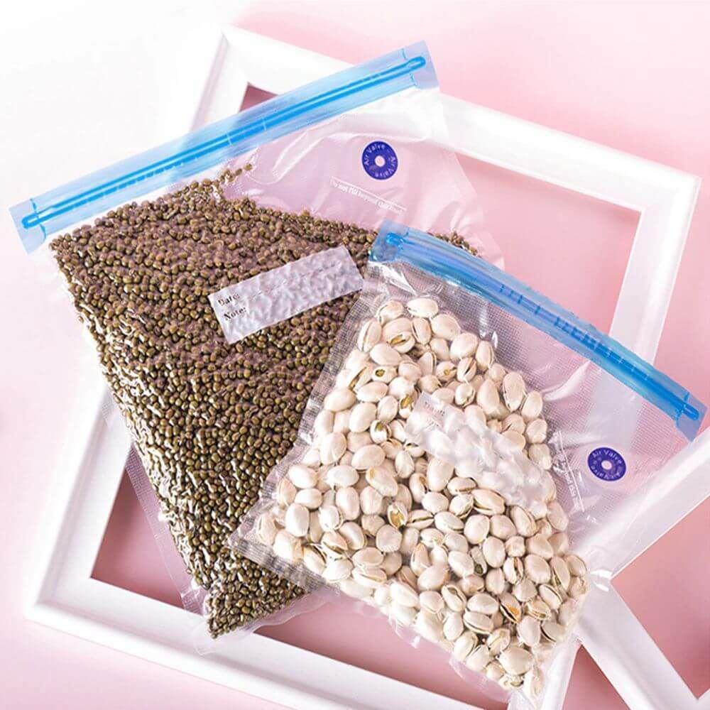 Jedzenie pozostaje świeższe, soczyste i nie wysycha. Dzięki workom zaoszczędzisz też sporo miejsca. Możesz je wypełnić także produktami sypkimi – to już zależy od Ciebie. Torebki można opisać markerem, dzięki czemu łatwiej utrzymasz porządek w lodówce lub zamrażarce.