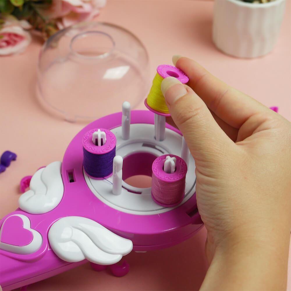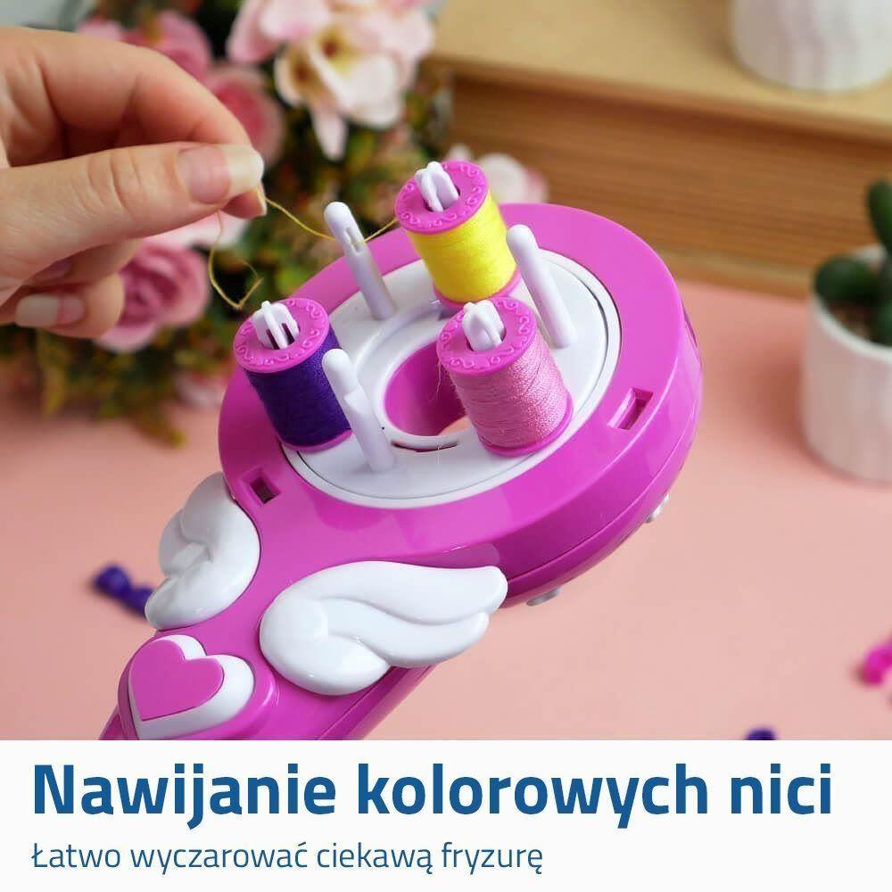 Dzięki tej plecionce do warkoczyków, każdy będzie w stanie stworzyć unikalne fryzury jednym naciśnięciem przycisku! Dziecięce włosy zaplączesz razem z trzema różnymi kolorami nici, a całą fryzurę uzupełnisz załączonymi spinkami. Twórz różne fryzury, ozdabiaj włosy, po prostu baw się. Niech twoja mała księżniczka spełni swoje marzenia o byciu księżniczką lub fryzjerką, z tą plecionką na pewno przeżyje mnóstwo zabawy.