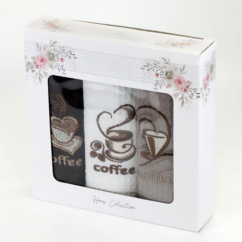 • Ręczniki waflowe w zestawie prezentowym z dekoracją filiżanek kawy i napisami "coffee"