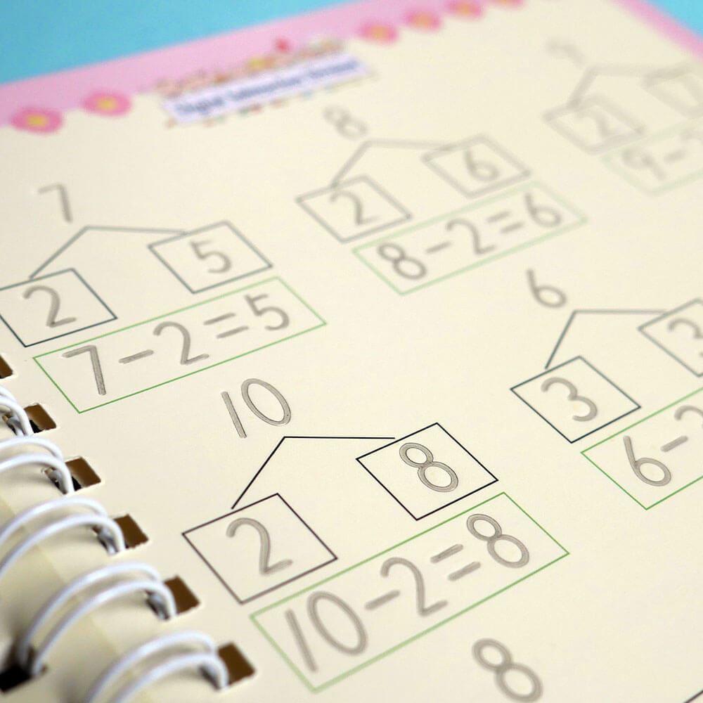 Zeszyty ćwiczeń są w całości w języku angielskim – dzieci przy okazji utrwalą podstawy angielskiego. Zeszyt poświęcony alfabetowi uczy poprawnego pisania wszystkich literek, a wytłoczone rowki ułatwiają naukę pisania po śladzie. Dzięki temu maluchy nauczą się, jak prawidłowo prowadzić rękę podczas pisania. Kolejny zeszyt, podobnie jak alfabet, koncentruje się na pisaniu cyfr. Zeszyt do rysowania wspiera rozwój małej motoryki i ćwiczy precyzję ręki. Ostatni zeszyt skupia się na podstawach matematyki – dokładnie na dodawaniu i odejmowaniu. Każdy zeszyt zawiera 18 stron pełnych ciekawych zadań dla sprytnych dziewczynek i chłopców.